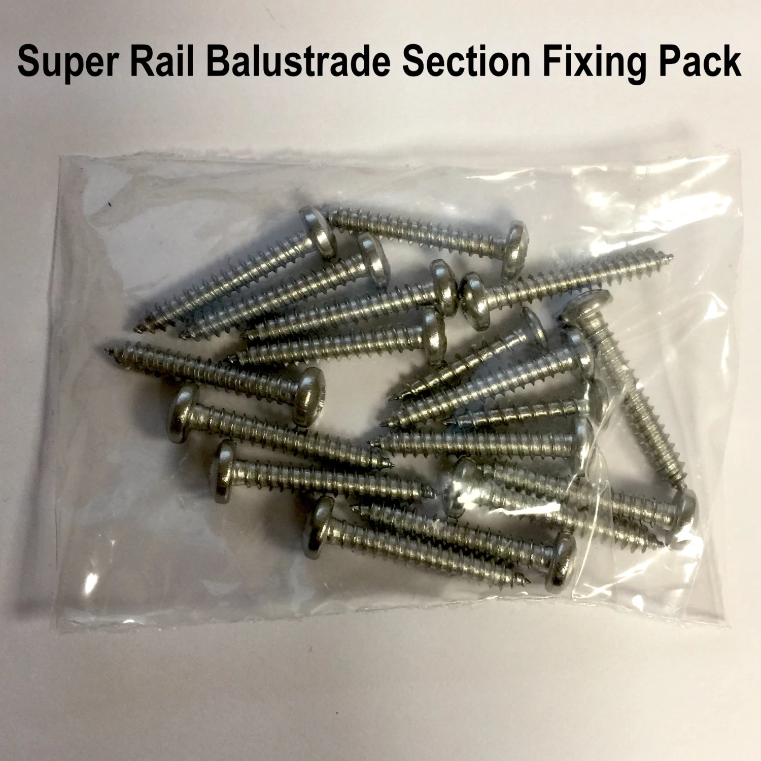 This pack contains the screws needed to attach 1 Super Rail Balustrade section.